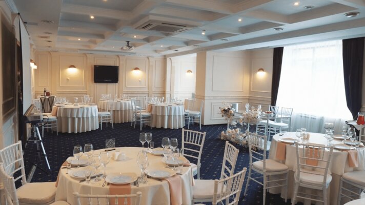 - Банкетный зал «Классика» (вместимость до 45 человек). Современное звуковое оборудование, проектор и экран, система кондиционирования, панорамный вид на сосновый бор.