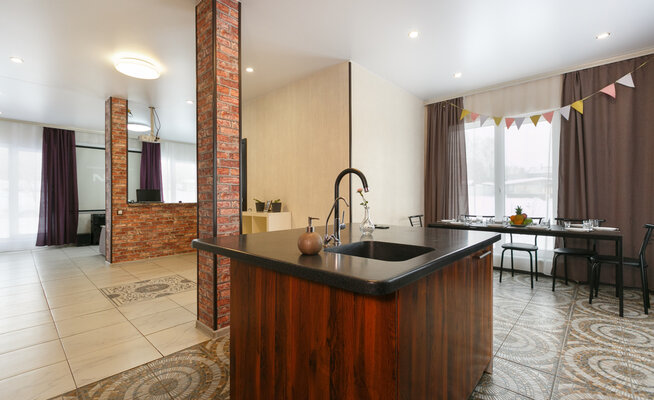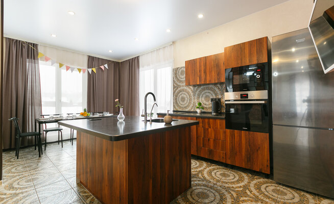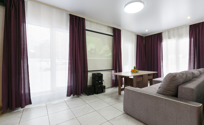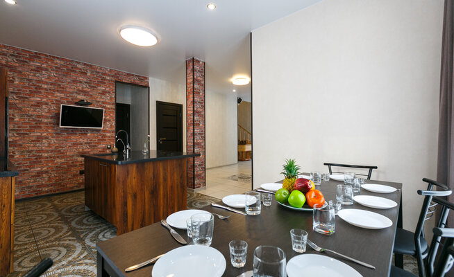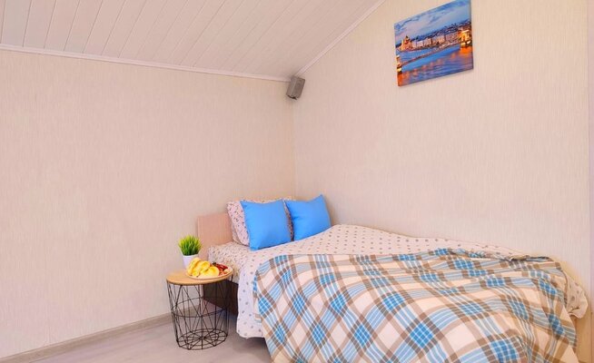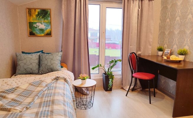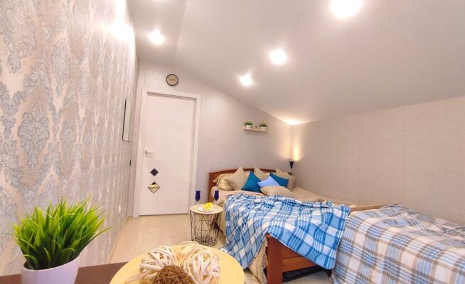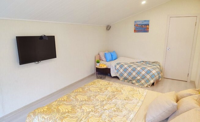 Гостевой дом представлен 12 спальными местами с удобными раскладными диванами, одно- и двуспальными кроватями с ортопедическими матрасами. Просторная детская комната с игрушками и спортивным модулем для самых маленьких гостей. Полностью оборудованная кухня с посудомоечной машиной, холодильником, варочной панелью, микроволновой печью, электрическим чайником и полным комплектом посуды.
