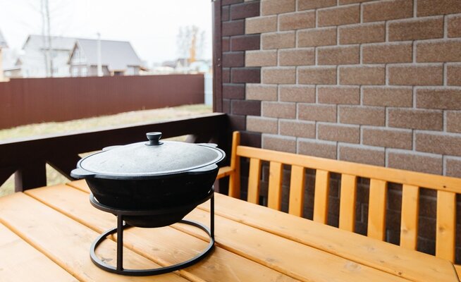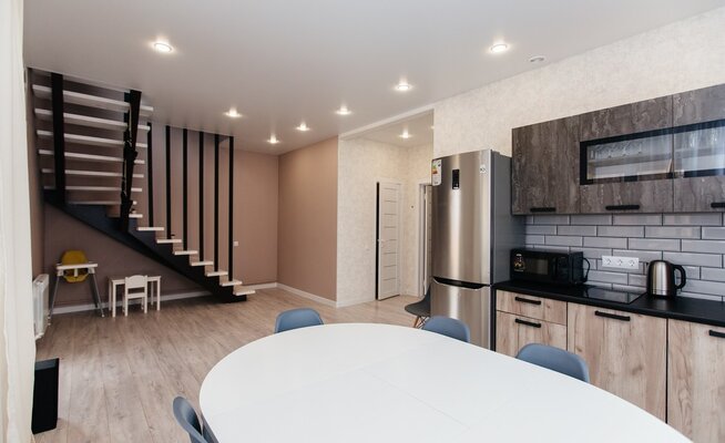Двухэтажный дом занимает просторную территорию с большой зоной отдыха и беседкой. На террасе вы сможете наслаждаться барбекю, используя мангал с печью под казан. Для вашего удобства предусмотрено парковочное место. В самом поселке есть детская игровая площадка, где ваши дети могут весело провести время.