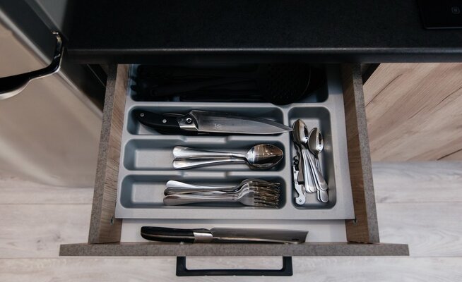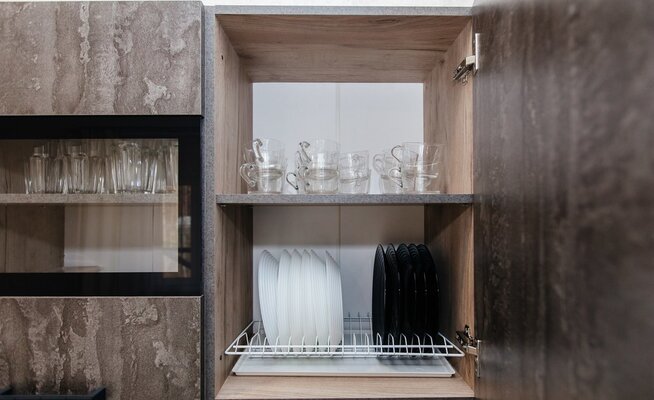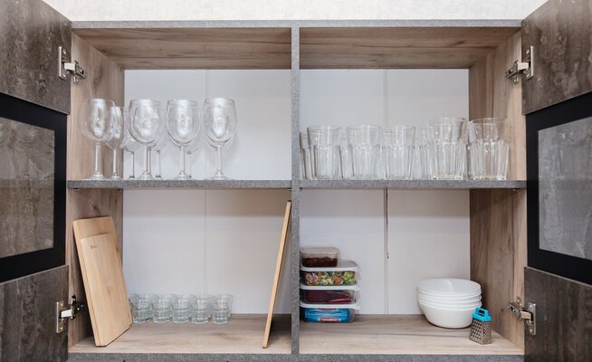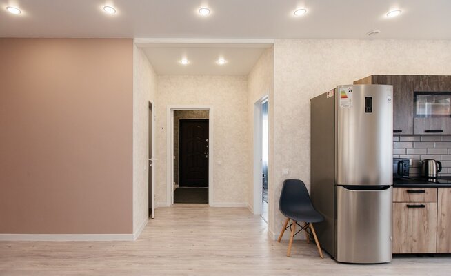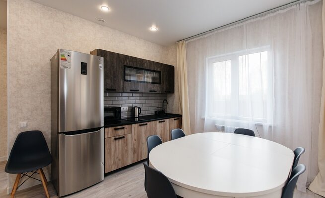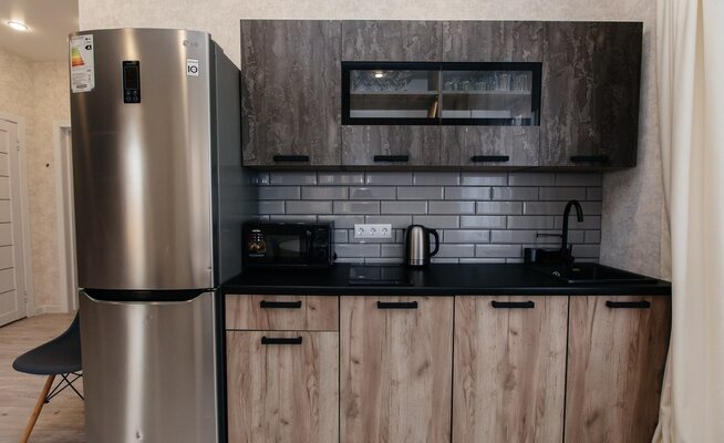 Полностью оборудованная кухня: холодильник, варочная панель, микроволновая печь, чайник, посуда и столовые приборы.