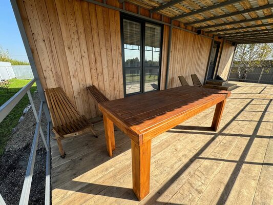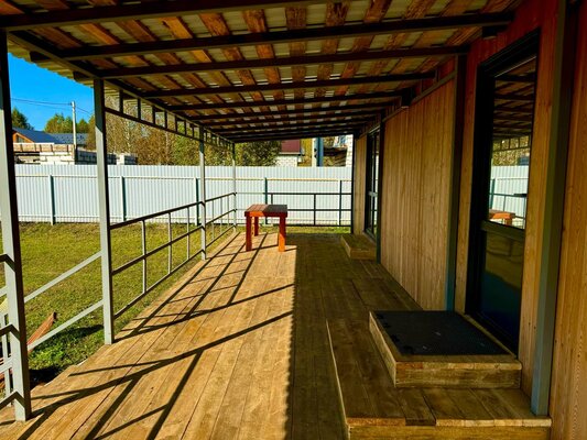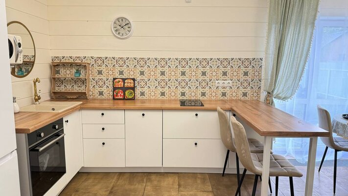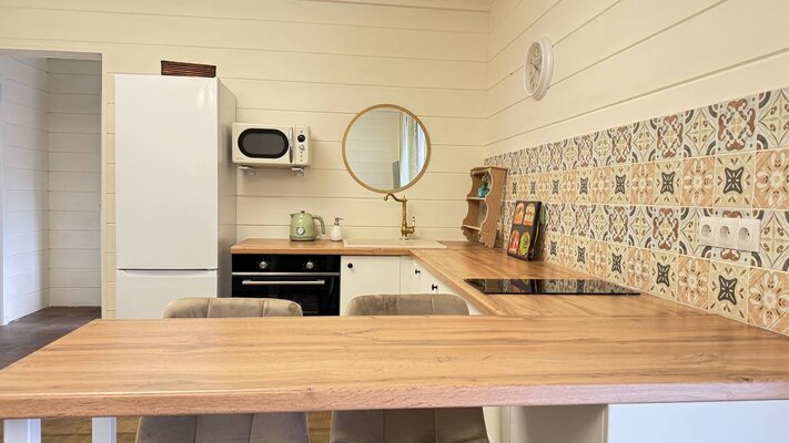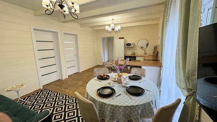 Уютный одноэтажный домик с просторной террасой расположен на небольшом, но тщательно благоустроенном участке. Внутри вас встретит современный интерьер с тёплыми полами: три комфортабельные спальни, светлая гостиная, объединенная с полностью оборудованной кухней, а также санузел с ванной. Кухня оснащена электроплитой, всей необходимой бытовой техникой и полным набором посуды для вашего удобства.
