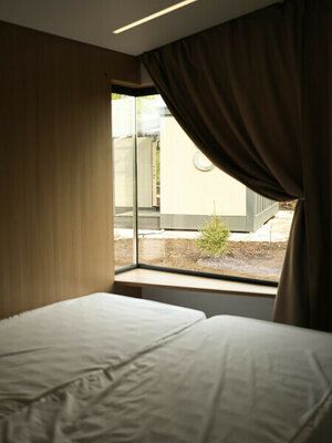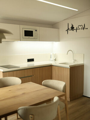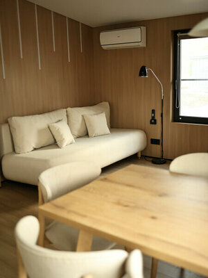 Ваш просторный глэмпинг-дом — это оазис уюта и функциональности. К вашим услугам комфортная спальня с двуспальной кроватью для глубокого сна, уютная гостиная зона с раскладным диваном и полностью оборудованная кухня, где вы найдете все необходимое для приготовления любимых блюд. Отдельная ванная комната с душем дополнит ваш комфорт. Мы позаботились о деталях: в специальных сервис-боксах вас ждут приятные мелочи и полезные принадлежности для незабываемого досуга.