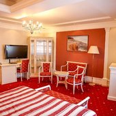 К услугам гостей 30 номеров гостиницы (Первая категория Стандарт и Улучшенный, Джуниор сюит, Люкс): климат-контроль, сейф, минибар, Wi-Fi и 2 стационарных рабочих места с ПК (на компьютерах установлена программа Skype) в холле 2 этажа отеля, ресторан, фитнес-студия с каскадным бассейном и саунами.