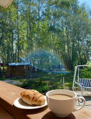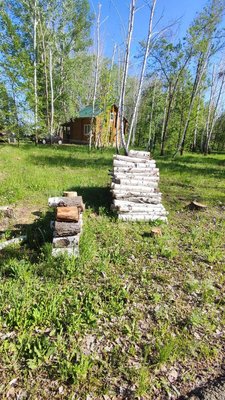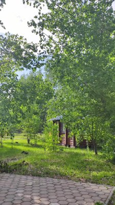 Для двухместных домиков летний душ и туалет расположены на улице, недалеко от них.
