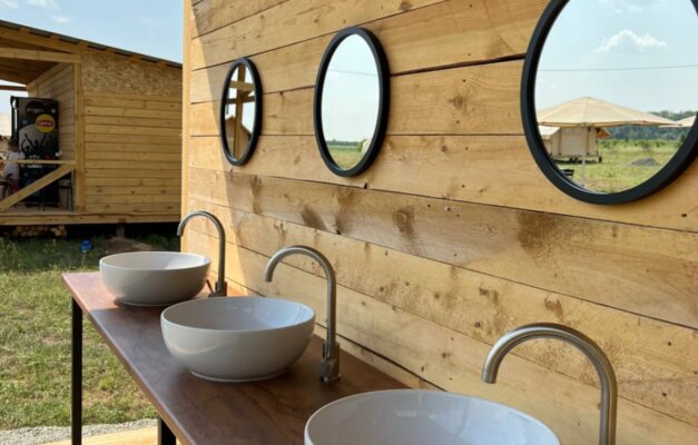 Душ (горячая, холодная вода), умывальники с зеркалами, туалет.