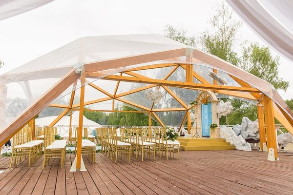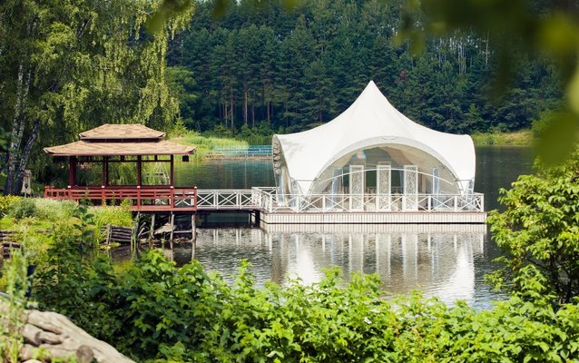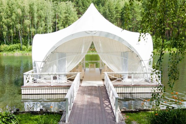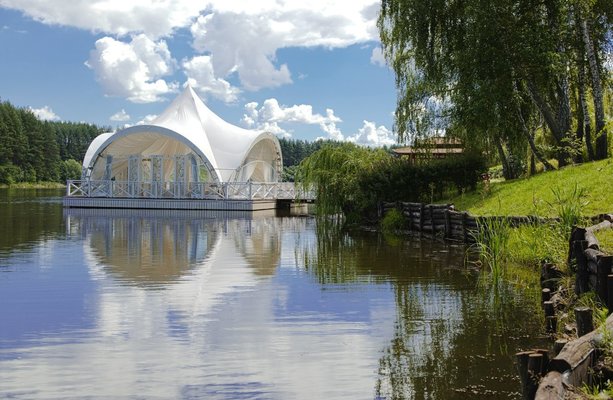 Площадка, как уже понятно из названия, находится на берегу озера. Просторный шатер современного дизайна полусферической формы, с предусмотренной для плохой погоды системой герметизации. Окружен зеленью, цветниками и топиарными фигурами. Красиво и торжественно. Прекрасное место, чтобы провести банкет или просто посетить его как летний зал ресторана
