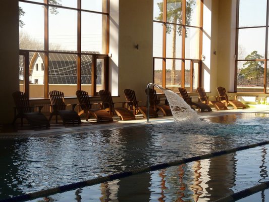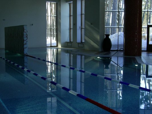 Изюминкой оздоровительного комплекса является бассейн, оборудованный аэро- и гидромассажными форсунками, устройством противотока и двумя миниводопадами.