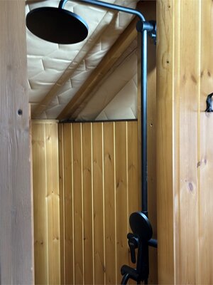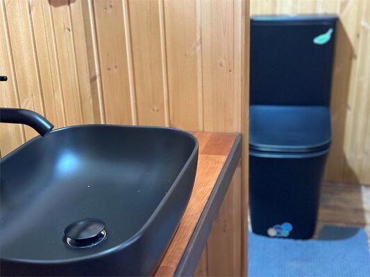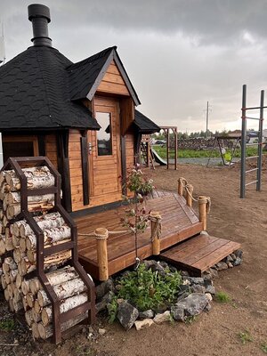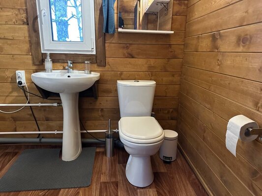 Один гриль-домик расположен не далеко от бани-бочки. Удобства с холодной и горячей водой находятся в сан блоке, 50 м от Гриль-домика.