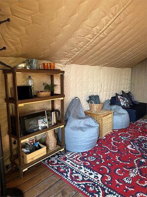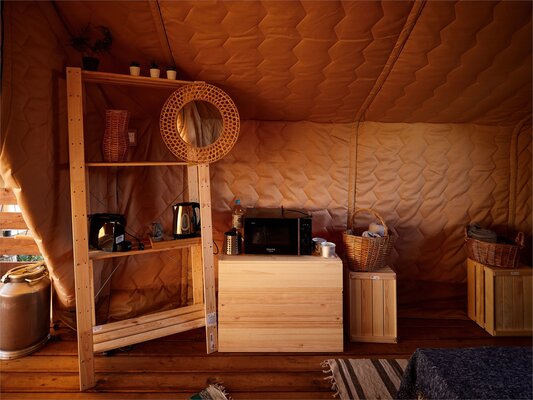 Пати-тент — это большой уютный сафари-тент, с инфракрасным обогревателем, релакс-зоной, стульями и столами, оборудованный бытовой техникой (холодильник, чайник), мангальной зоной.