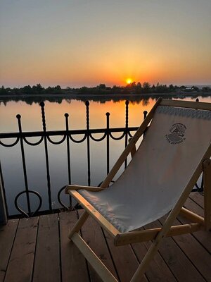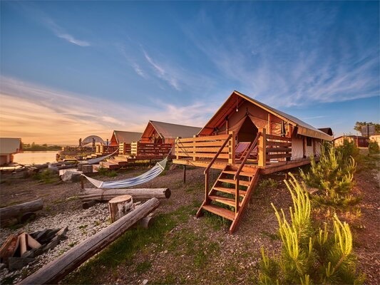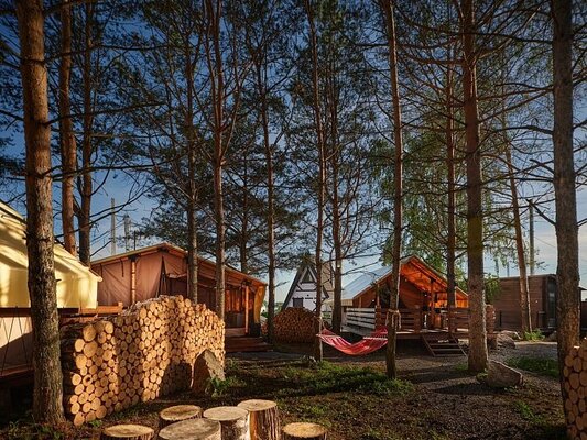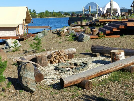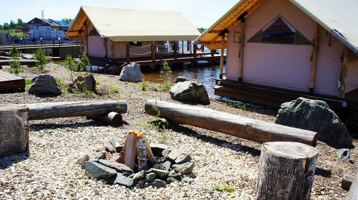 Инфраструктура глэмпинга поражает своим разнообразием: живописная набережная, пляж, причалы и пирсы для лодок и гидроциклов, спортивные и детские площадки, беседки, зоны для костров и барбекю, кедровая баня-бочка с захватывающим видом на закат, плавучая баня на воде с закрытой террасой, японский чан Фурако и многое другое.
