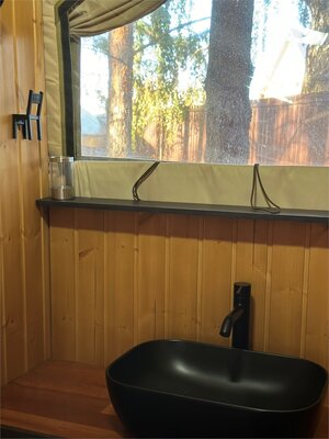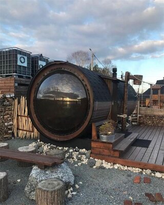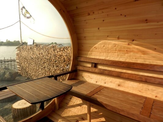 Кедровая баня-бочка с панорамным окном, с видом на залив и закат, с ванной под открытым небом. Небольшая комната отдыха со столом и скамейками. Душевая, парилка.