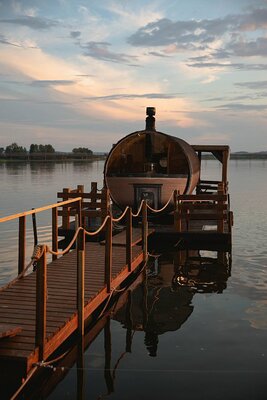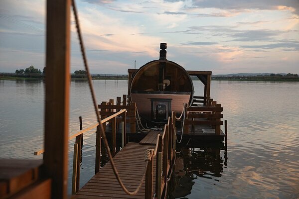 Баня-бочка расположена на понтоне в живописном месте залива р. Камы.