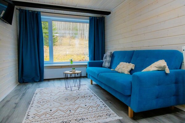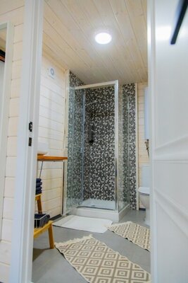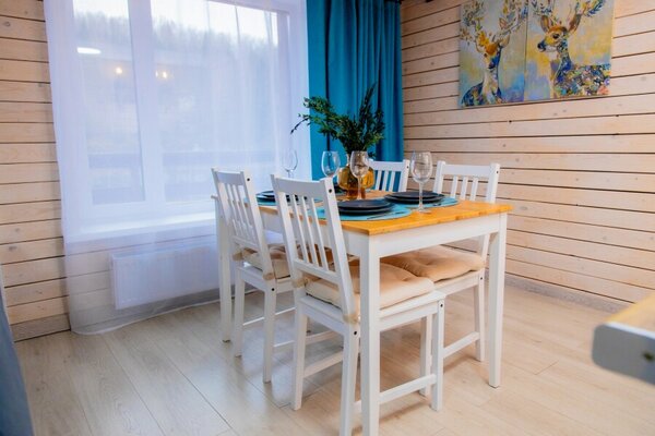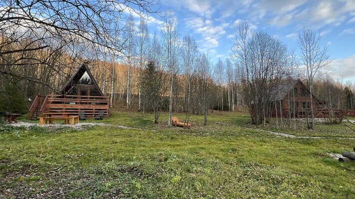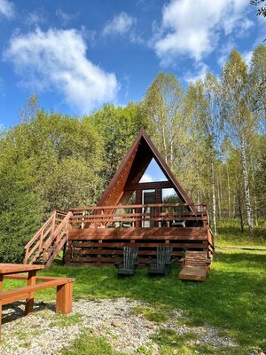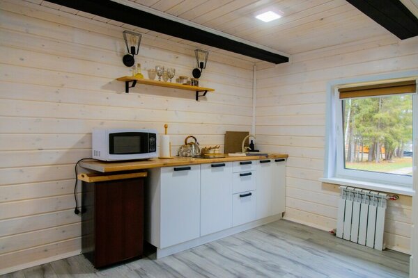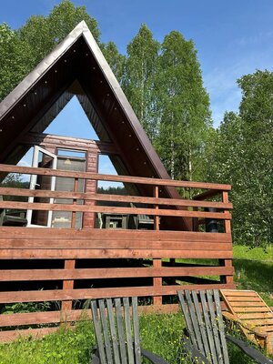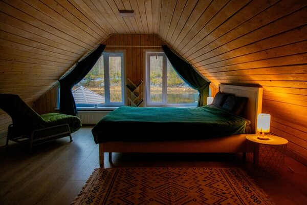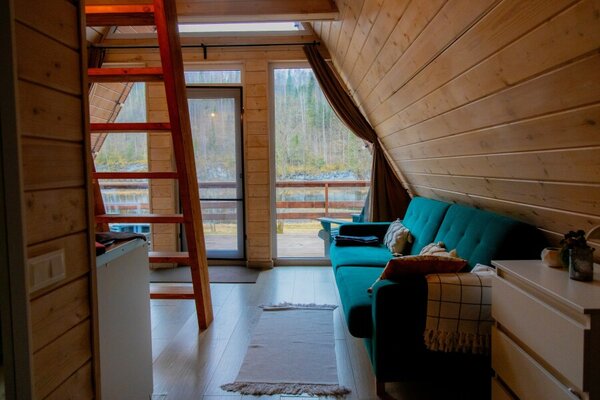 Для проживания гостей организованы уютные домики с панорамными окнами, открывающими великолепные виды на лес, горы и реку. Каждый дом оборудован всем необходимым для комфортного отдыха, включая кухню с бытовой техникой и посудой, гостиную с телевизором и собственный санузел с душем. Бесплатный Wi-Fi доступен в каждом домике.