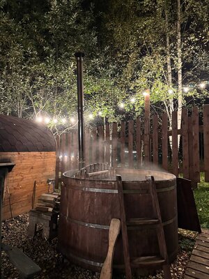 Круглая деревянная купель с подогревом воды, с погружения в которую и начинается церемония бани офуро. Благодаря погружной дровяной печи, температура воды поддерживается на уровне 40 °С.