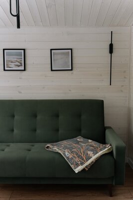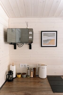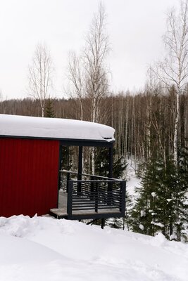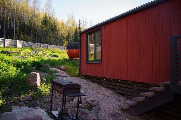 Любители барбекю по достоинству оценят наличие индивидуального мангала с крышкой. Шампуры и решетка предоставляются, а уголь и розжиг рекомендуем взять с собой. Кроме того, к Вашим услугам уникальная баня с панорамным окном, где можно насладиться паром и умиротворяющими видами леса.
