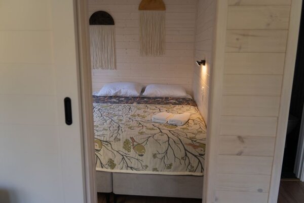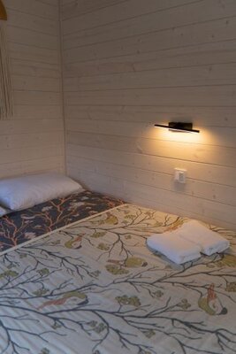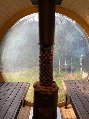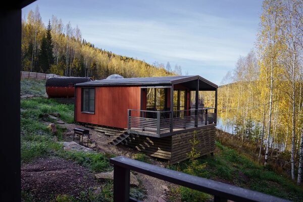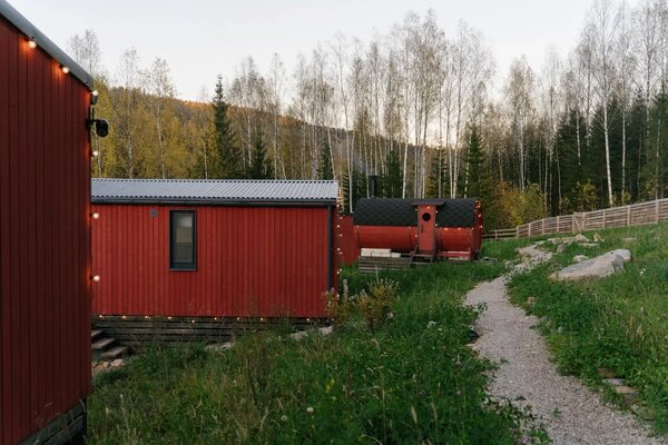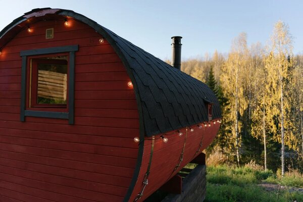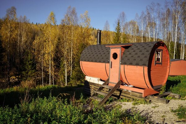 На территории глэмпинга находится уютная баня-бочка с впечатляющим панорамным окном. Здесь гости могут расслабиться и насладиться видами на окружающий лес без ограничения по времени, наслаждаясь паром и гармонией природы.