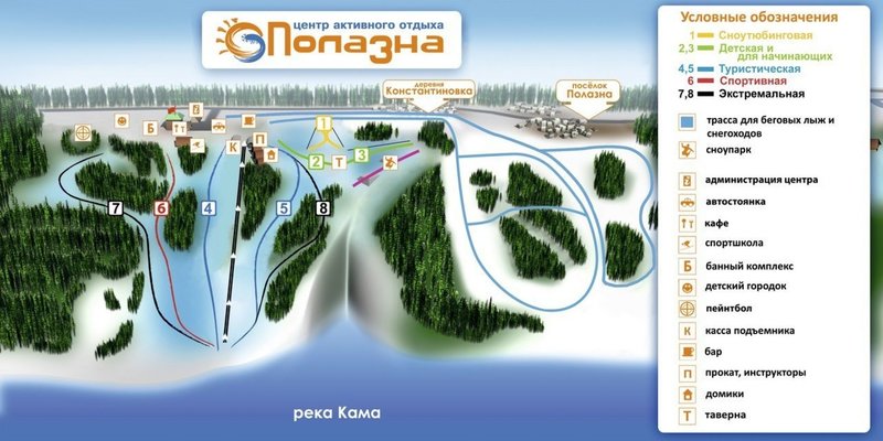 1.Приятная атмосфера 2.Вид 3.кафе 4.музыка 5.тюбинг Для новичков в самый раз