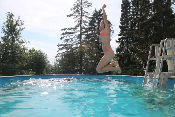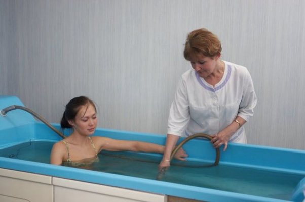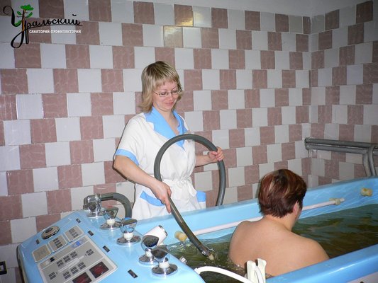 В санатории имеется два бассейна. Большой бассейн – 6 дорожек по 25 м, глубина мелкой части – 1,5 м, глубокой части – 2,5 м. Малый бассейн – размер 8 м х 12 м, глубина мелкой части – 50 см, глубокой – 90 см. Также в бассейне находится солярий (вертикальный, с вентилятором).