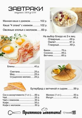 Вы можете заказать доставку вкусного завтрака в номер в любое удобное для Вас время с 08:00 до 11:30.
