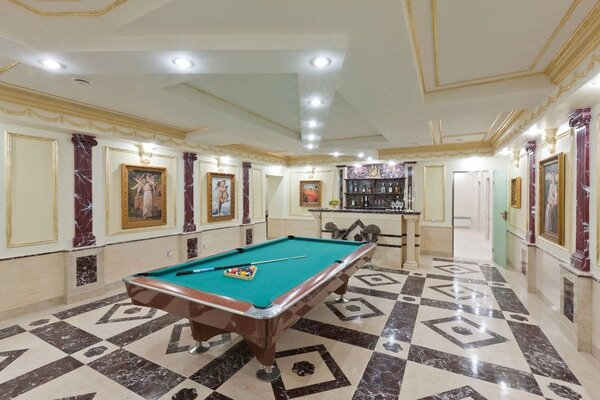 Уютные изящные интерьеры в классическом стиле с элементами барокко, две комнаты отдыха с роскошной мебелью и настоящим американским бильярдом, элегантный обеденный зал на двадцать персон, где приятно и небольшим составом отдохнуть, и многочисленной компании будет удобно. И кстати, меню и обслуживание здесь с одиннадцати часов утра и до полуночи как в настоящем ресторане.