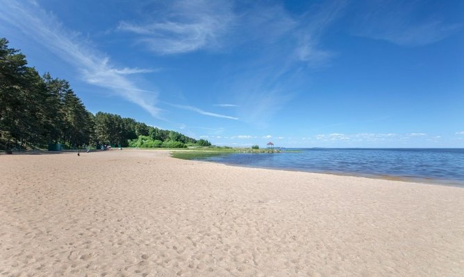Благоустроенный пляж для отдыха с мелким привозным песком, протяжённостью 150 метров вдоль береговой полосы Псковского озера — крупнейшего водоёма региона. Пляж оснащён стационарными зонтиками, шезлонгами, кабинками для переодевания и пляжным душем, а в шаговой доступности находится санузел с горячей водой.