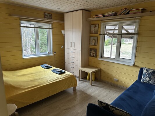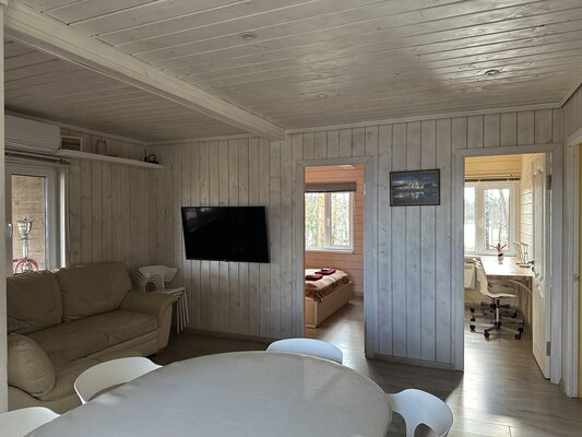 В доме есть все необходимое для комфорта: климат-контроль, современная кухня и Wi-Fi. Рядом расположены мини-футбольная площадка, живописный лес с грибами и ягодами, а также два озера для рыбалки и спокойного отдыха.
