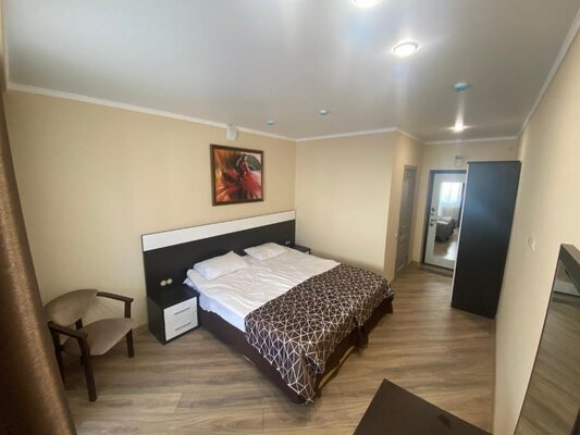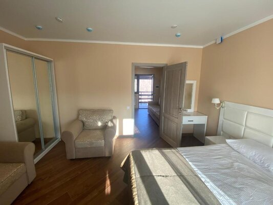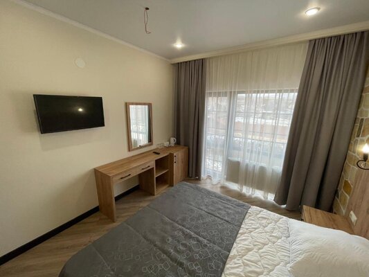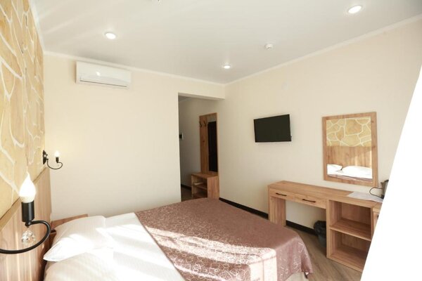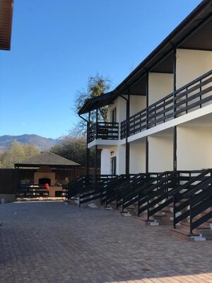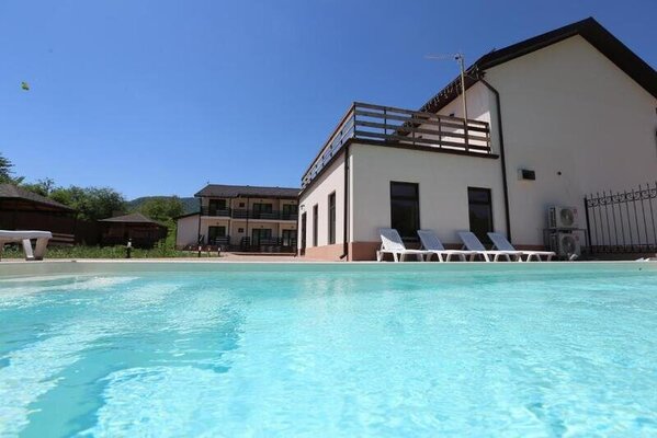 На территории гостевого дома под открытым небом с видом на горы располагается подогреваемый бассейн. Комфортная температура воды в бассейне круглый год. В темное время суток работает подсветка.
