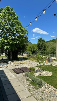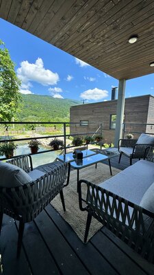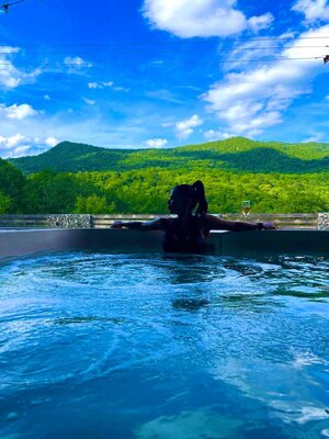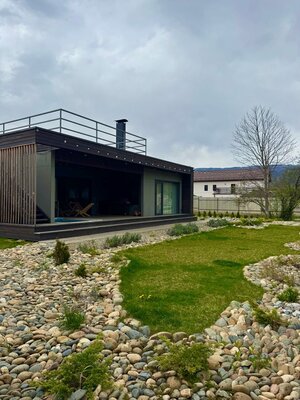 Из бани открывается панорамный вид на горы и есть выход к собственному пруду.