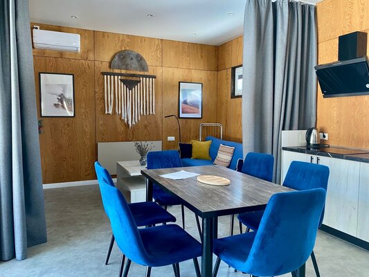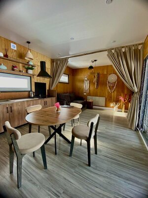 Каждый коттедж, рассчитанный на 6 человек, создан с использованием натуральных материалов и продуман до мелочей, чтобы из любого уголка открывался потрясающий панорамный вид. Здесь вас ждут три отдельные спальные зоны, полностью оборудованная кухня для ваших кулинарных идей и современный санузел.