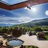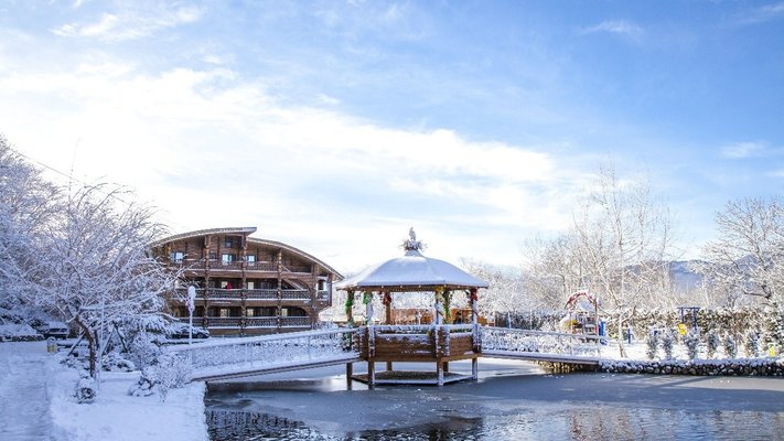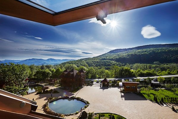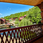 Ухоженная территория с авторским ландшафтным дизайном, пруды с грациозными лебедями, озеро для рыбалки, горный питьевой источник, две баньки на дровах, одна из которой с купелью наполненной родниковой водой, удобные беседки, детская площадка с батутом и тренажерами, детская комната с аниматорами, бесплатный бильярд и настольный теннис, а так же уникальный мини-зоопарк!