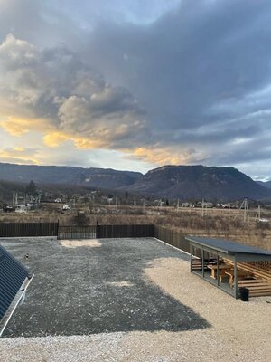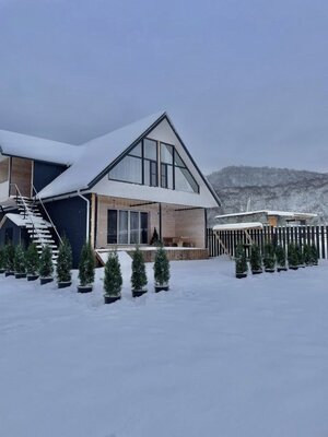 Второй этаж с отдельным входом разделен на два одинаковых номера, каждый из которых способен принять до 4 гостей. В каждом номере есть отдельная спальня, гостиная с раскладным диваном, кухня, санузел и панорамные окна с видом на гору. Также доступна зона для мангала.