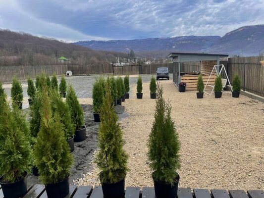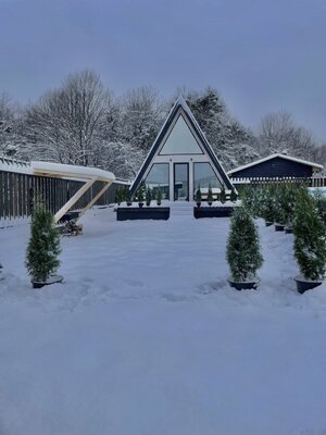 На территории также есть отдельный двухэтажный дом типа A-frame, который рассчитан на 4 гостей. На первом этаже расположены кухня, гостиная с раскладным диваном и ванная комната, а на втором этаже - спальня.
