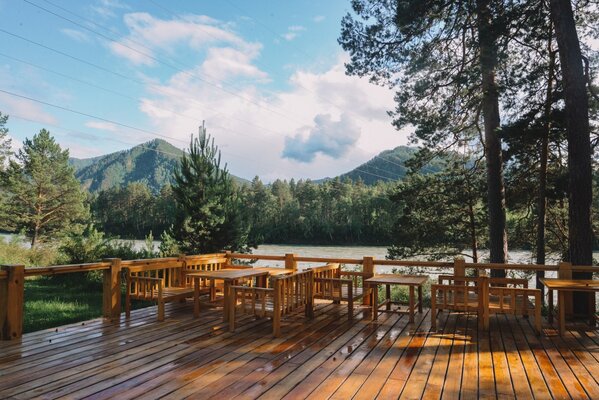 Ресторан с летней террасой расположен на живописном берегу реки Катунь и предлагает своим гостям насладиться разнообразными блюдами русской и европейской кухни, а также утонченными вегетарианскими деликатесами и уникальными дарами Алтая. Многообразие кулинарных изысков делает меню привлекательным как для юных гурманов, так и для искушенных ценителей.