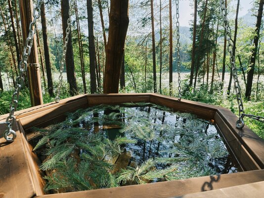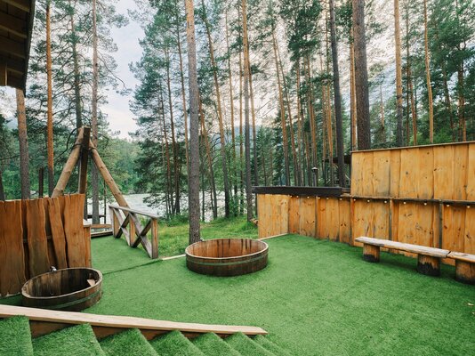 Горячий банный чан, находящийся рядом с Большим банным комплексом, предназначен для гостей, которые выбрали этот замечательный вариант для своего отдыха. Насладившись приятной атмосферой, они смогут расслабиться и получить незаменимые моменты уединения и восстановления.