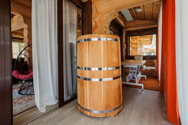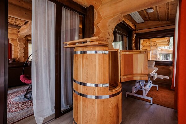 Рядом с Малым банным комплексом расположен горячий банный чан. Этот изысканный элемент банного искусства предназначен для гостей, выбравших эту баню, и является неотъемлемой частью ее посещения, включенной в стоимость.