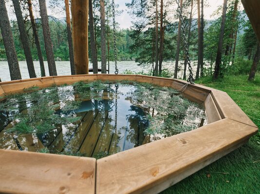 Малый банный комплекс, уютно расположенный на берегу Катуни, может принять до четырех человек и предлагает идеальные условия для полноценного отдыха. Гости могут насладиться горячим чаном и воспользоваться всем необходимым: от бутилированной воды до банных принадлежностей и березового веника.
