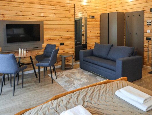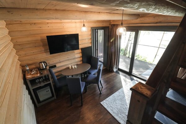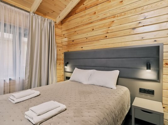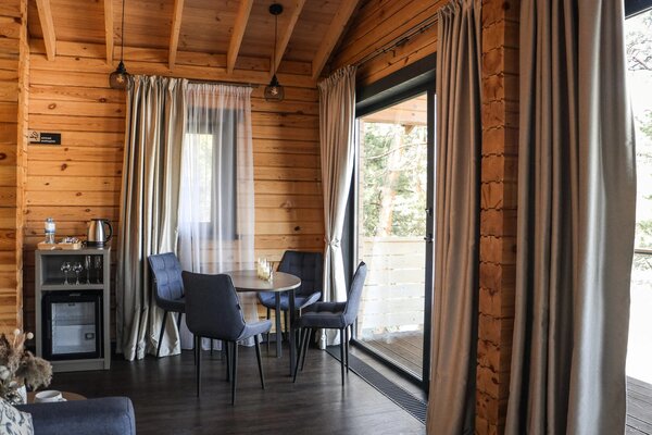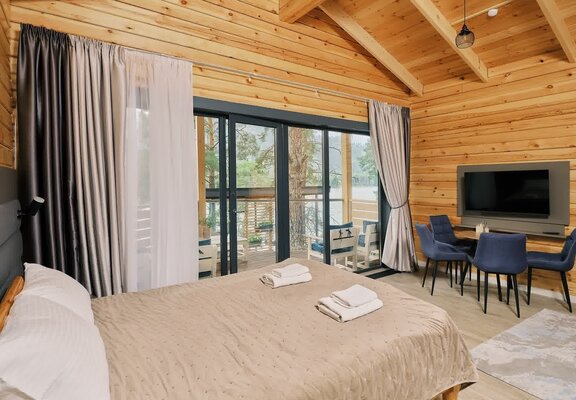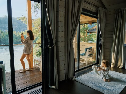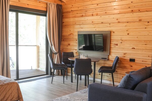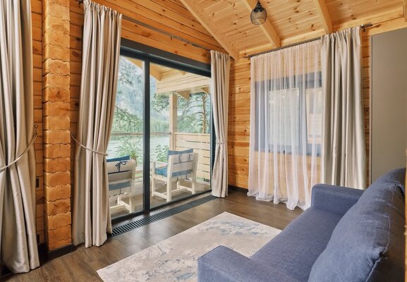 К вашим услугам десять уютных деревянных шале, каждое из которых гарантирует панорамный вид на реку и собственную террасу для приватного отдыха. Все шале полностью благоустроены и оснащены всем необходимым для вашего комфорта: удобный диван, чайный столик, телевизор и мини-бар. В ванной комнате предусмотрены душ, туалетные принадлежности, набор полотенец, тапочки и фен. На всей территории отеля действует бесплатный Wi-Fi.