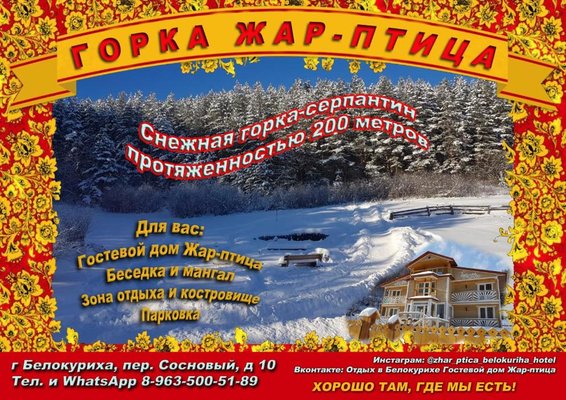 Гостевой дом «Жар-птица» расположен в Белокурихе. В 800 метров от гостевого дома находятся курортные территории и вся курортная инфраструктура.