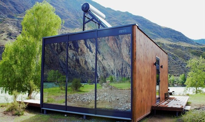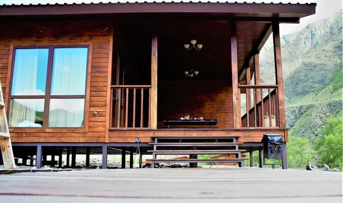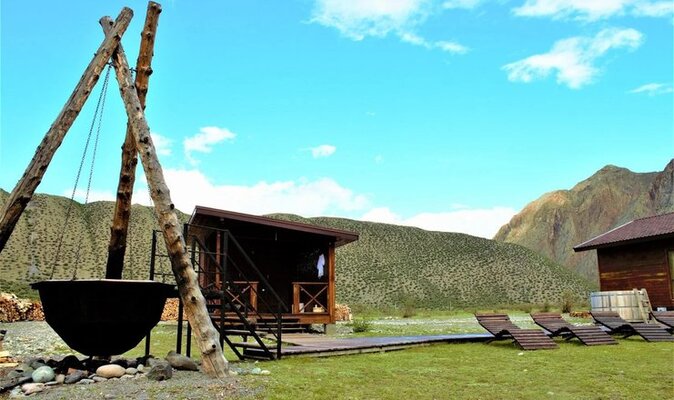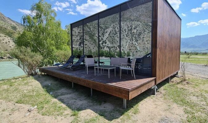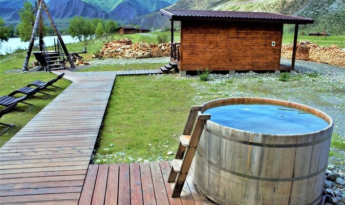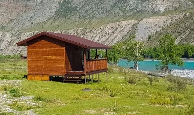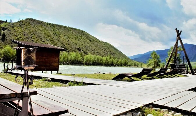 Ресторан базы отдыха окружен алтайскими горами, плавно перетекающими из одного образа в другой. Скалистые вершины, сменяются лесным высокогорьем. Таежный лес плавно переходит в ароматные луга, а правит всем величественная река Алтая - бирюзовая Катунь.
