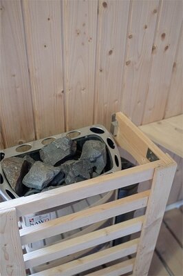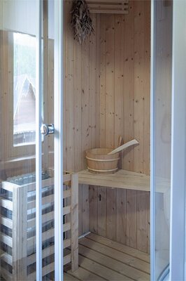 Маленькая банька на озере с видом на горы. Есть возможность окунаться в крытой купели. Рассчитана на компанию 2-4 человека.