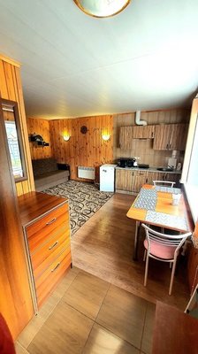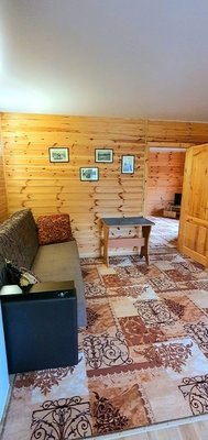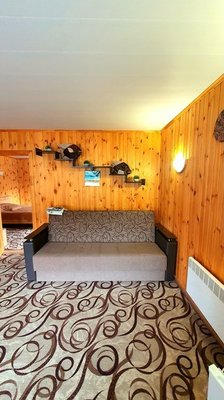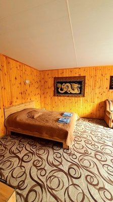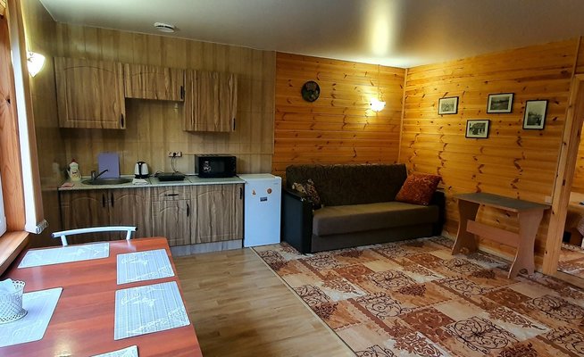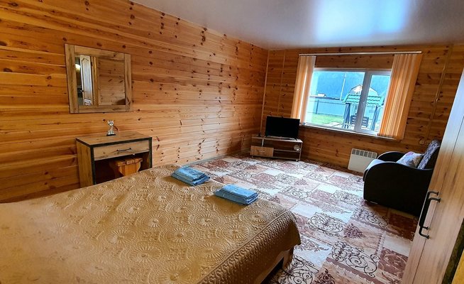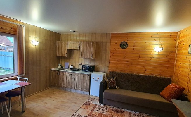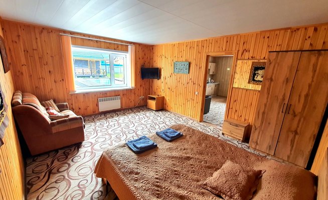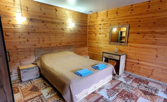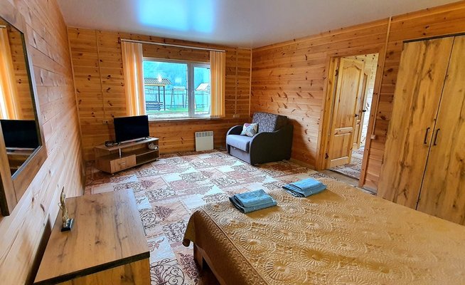 Всего три дома. В каждом есть две комнаты; в спальне расположена двуспальная кровать, прикроватные тумбочки, телевизор шкаф и кресло-кровать для дополнительного размещения. В гостиной вы найдете уютную мягкую мебель. Обеденная зона соединена с полностью оборудованной кухней, где есть все необходимое для самостоятельного приготовления пищи. В каждом доме есть санузел с душевой кабиной, горячей и холодной водой. На веранде — удобная мебель для отдыха на свежем воздухе.