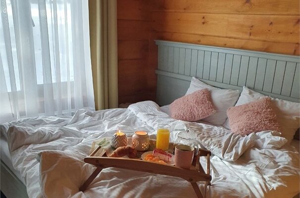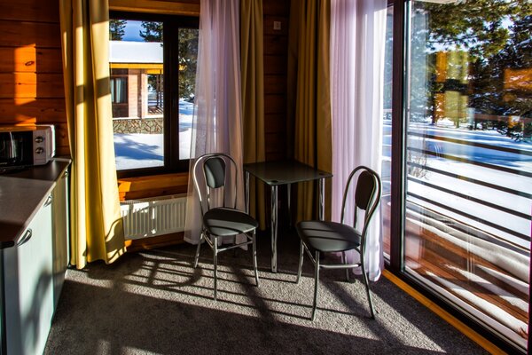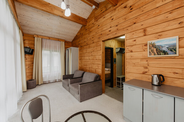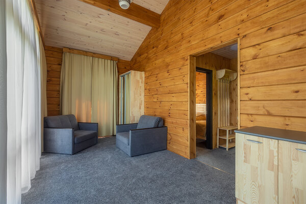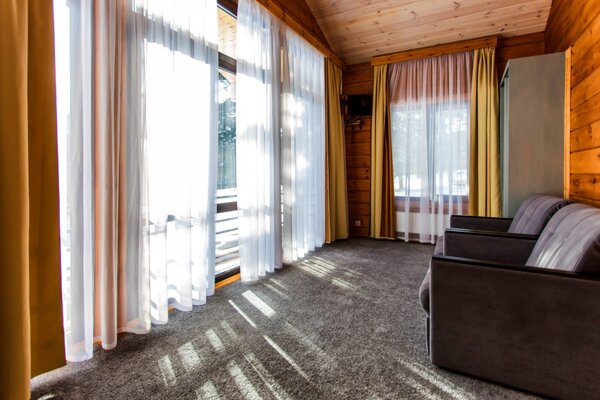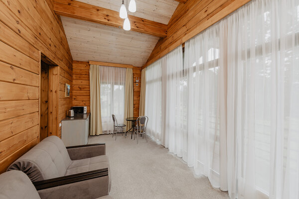 Отель расположен в лесном массиве и состоит из пяти отдельно стоящих деревянных коттеджей. Каждый коттедж предлагает две комнаты, собственный санузел, панорамные окна и террасу с прекрасным видом на горы. Внутри номеров гостей ждет уютная обстановка с расположением кроватей по желанию, ТВ, Wi-Fi и кухонной зоной со всем необходимым оборудованием.