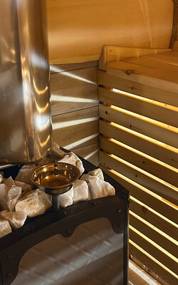 Кедровая фитобочка (парение с аромафитосбором алтайских трав) находится в банном комплексе.