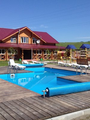 На берегу Катуни В отдалении от дороги (нет шума и пыли) Много травки чтобы детки бегали Детская площадка Вкусное питание 2 бассейна с подогревом Большие окна в домиках