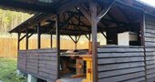 Открытая беседка с кухней, посудой и мангальной зоной.