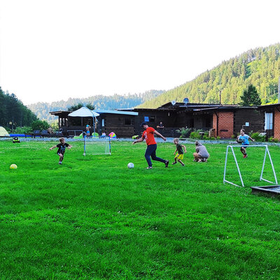 Для маленьких гостей создано игровое пространство на полянке возле реки. Здесь есть детская площадка с горкой и качелей, песочница и игрушки.