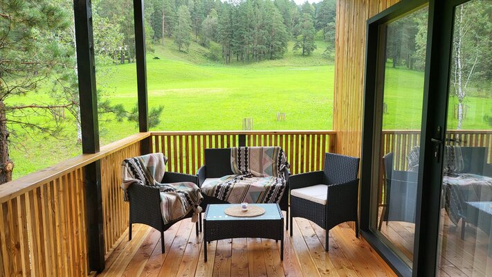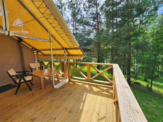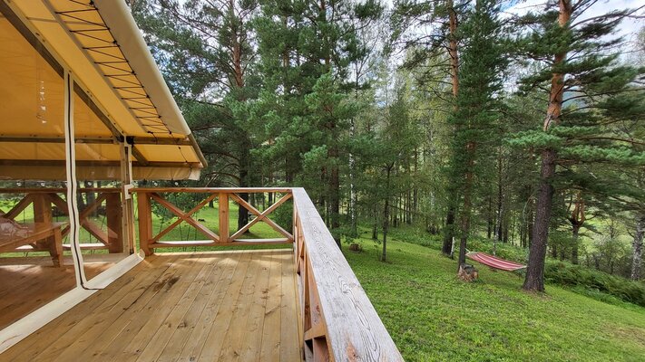 На территории глэмпинга вас ждут уютные зоны отдыха с мангалами, бесплатная парковка, скоростной Wi-Fi, качели, гамаки и живописные прогулочные маршруты. Насладитесь потрясающими видами на горы, лес и реку с уютной террасы, а вечером соберитесь у костра на специально оборудованном островке посреди реки Узнезя.
