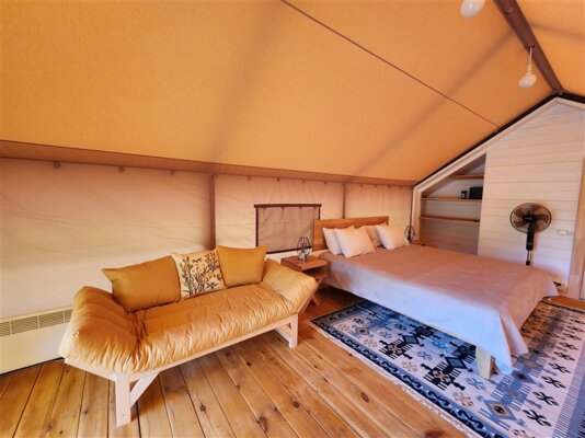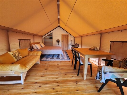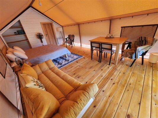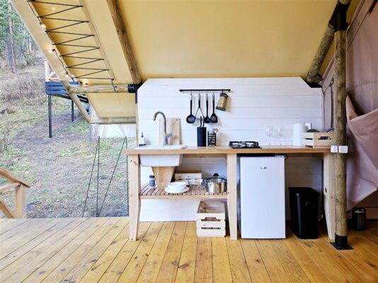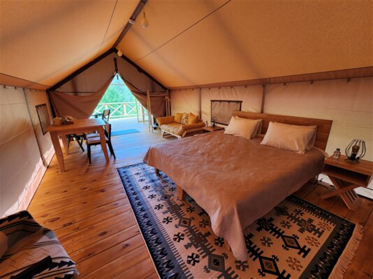 К вашим услугам комфортабельные сафари-тенты и семейные апартаменты с кухней, отоплением, теплым полом и собственным санузлом. Каждая единица размещения оборудована современной кухней с бытовой техникой и посудой, а чистейшая питьевая вода подается прямо из скважины.