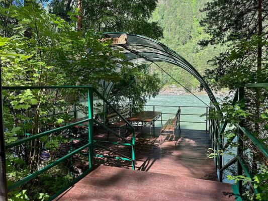 На территории базы размещается летний палаточный городок с видом на Катунь и песчаным берегом.