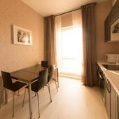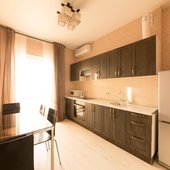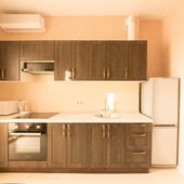 Для самостоятельного приготовления еды обустроена кухня современной техникой: плита, электрический чайник, микроволновая печь, холодильник. Кроме того, есть обеденный стол со стульями , посуда, чистящие средства.